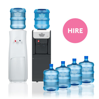 A sleekΒ Summer Springs water cooler, neatly in the corner. A 15L bottle of natural spring water perched on top like a crown.